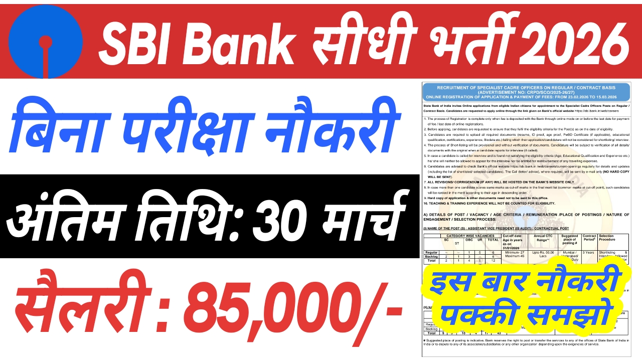 इस लेख में आपको SBI Bank SCO Recruitment 2026 से जुड़ी पूरी जानकारी जैसे – आवेदन प्रक्रिया, योग्यता, आयु सीमा, चयन प्रक्रिया, फीस, महत्वपूर्ण तिथियां आदि विस्तार से दी गई है।